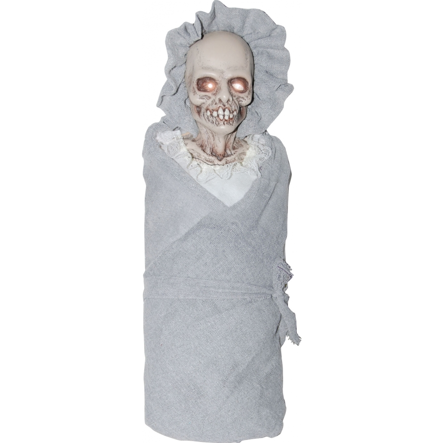 BABY CREEEPY PROP. Everyone loves a baby…until they see this one! A great prop for your haunted house or home haunt, this creepy baby doll will leave quite the impression. Skeleton head wrapped in bunting. Eyes light up. Creepy cradlesongs. Uses 3 AA batteries which are not included. 26 x 8 x 8 inches