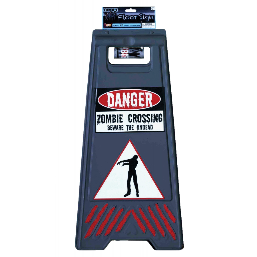 BEWARE OF ZOMBIE SIGN & TAPE. Warn your guests with this great Zombie Crossing sign! Caution sign is free-standing and comes with 20 feet of Zombie crossing tape to enhance your haunted scene. Perfect party decorations!