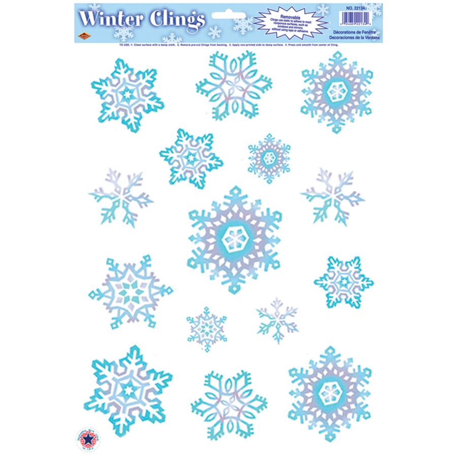 CRYSTAL SNOWFLAKE CLINGS. Assorted crystal-look snowflake clings for Christmas or any winter occasion. Perfect for any window, appliance, mirror, etc. 15 snowflake clings. Vinyl. 12in x 17in sheets.
