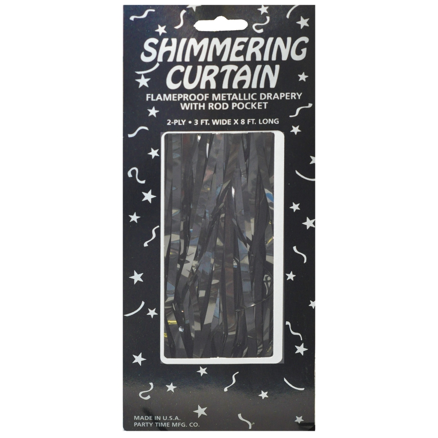 CURTAINS SHIMMER BLACK. 3 feet by 8 feet spangle curtains are ideal for all kinds of party decorations and stage backdrops. Very well made in glittery shiny vinyl. Morris offers shimmering curtains in custom lengths! (Special Order!)