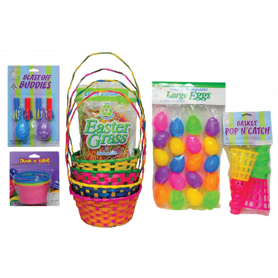EASTER BASKET SUPER KIT. The Super Easter Basket Kit is a great way to make multiple Easter baskets quickly and easily so you can save time, money and hassle and spend more time with your kids. The kit has everything you need to create 4 colorful baskets, just add your favorite candy! Makes 4 Easter baskets.— INCLUDES:(4) Round pastel bamboo baskets, 7.5″ x 3″ x 10.75″ handle (orange/pink, yellow/green, blue/yellow and pink/green) – (1) Pack of 20 2.5″ multicolored biodegradable eggs – (1) 1.5 ounce bag of 100% recycled paper grass with blended colors (**colors may vary) – (1) Dunk & Color kit (includes 5 reusable coloring cups, wire dipper, magic wax crayon, 5 coloring tablets) – (1) Pack of 2 Pop ‘N’ Catch Bunny Game ( includes 2 Bunnies & 2 Balls. **colors may vary) – (1) Pack of 2 Egg Blasters (includes 2 egg blasters and 4 missiles. **colors may vary)