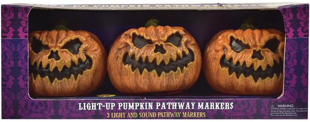 Perfect for adding that final touch to your home haunt these pathway markers will light the way to even more scares! 3 wonderfully sculpted plastic pumpkins that are sound and motion activated with four sayings/sounds and light that flash in rhythm