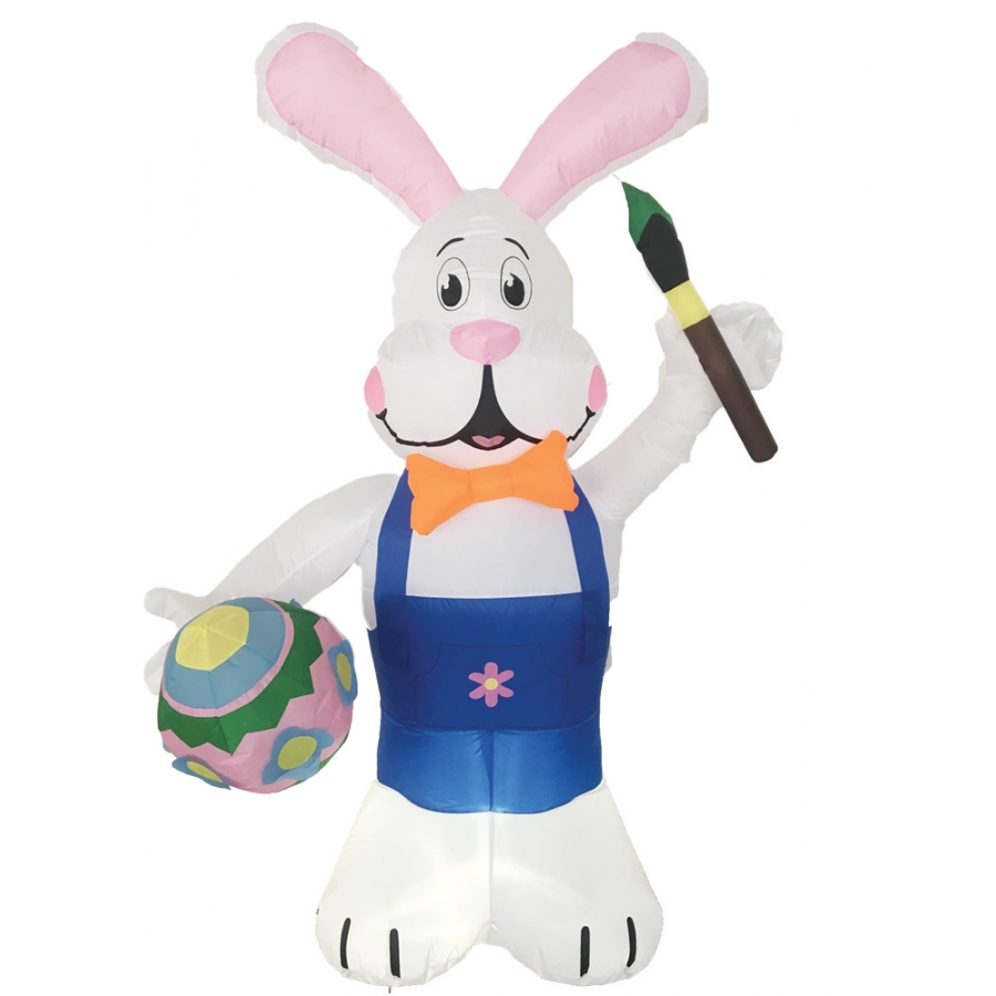 INFLATE BUNNY 7FT W BRUSH EGG. This Easter, do or dye with our 7 ft Inflatable Bunny with egg and paint brush in hand. All these inflatable props are made of durable waterproof polyester material and glow with bright LED lights! They self-inflate in seconds, and deflate quickly for easy compact storage. Included adaptor plugs into any 110 outlet and has a 3 foot cord. Safety and operation instructions are included, along with 3 ground anchor stakes. For indoor and outdoor use.