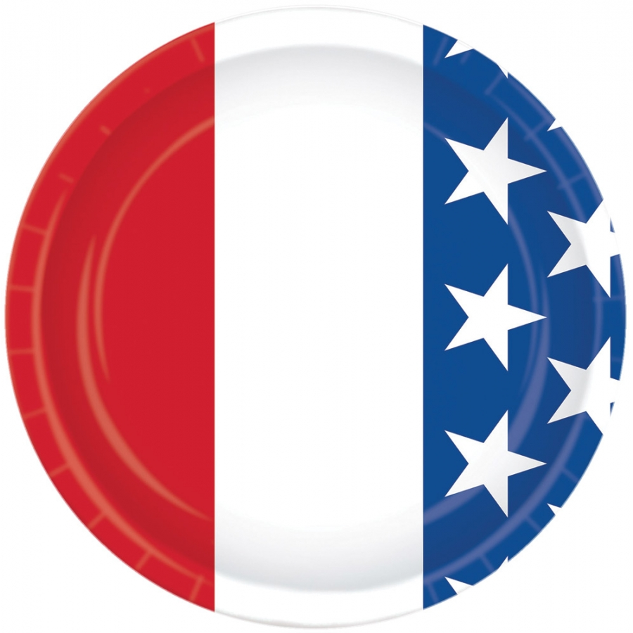 PATRIOTIC PLATES 7IN 8PC. The perfect party plate for any patriotic event from the fourth of July to armed forces and veterans gatherings. 7 inches, Red, White and Blue stripes with stars on plate. 8 to a package.