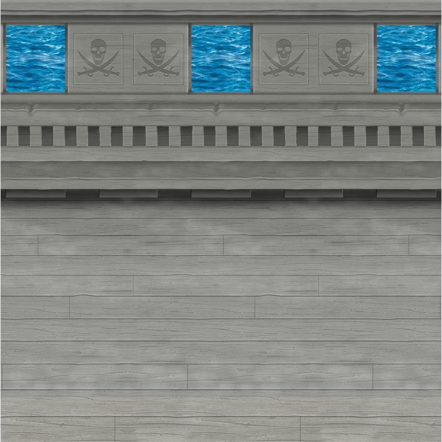 PIRATE SHIP BACKDROP 4 X 30FT. A great backdrop for your pirate party and maybe even your luau! Great for staging photos as well! Looks like you’re on the deck of a pirate ship with a view of the ocean! Measures 4′ x 30′.