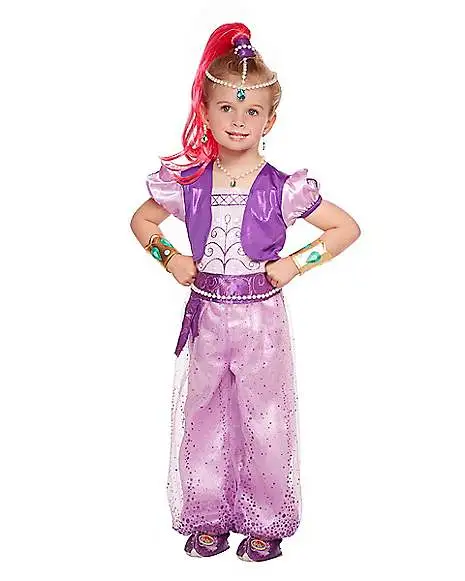 Dress your little one as her favorite genie this Halloween! This adorable Shimmer costume features a one piece jumpsuit that will have your toddler shining all night long. Sparkling detail adds a cute touch. The jumpsuit features short sleeves, and baggy pants with a mesh overlay. Add included wrist cuffs to complete the look.