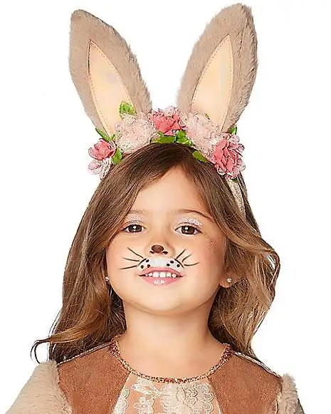 Your little one will make hearts hop in this sweet bunny costume! This bunny costume features a velour dress in light gold and rose tones. Gold trim, pink tulle, pale lace, and a fluffy bunny tail add stunning dimension to this charming ensemble! Dainty floral gloves are paw-sitively perfect. Complete the look with big bunny ears and a luxe flower crown.